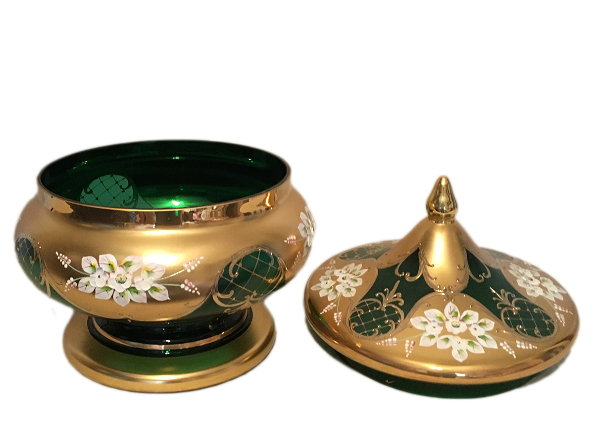 Bohemian Crystal High Enameled Candy Bowl Pear Green Color - Hand Made in Czech Republic