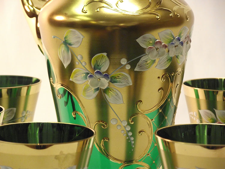 Bohemian Crystal High Enameled Water / Beer 7 pcs Set Green Color - Hand Made in Czech Republic