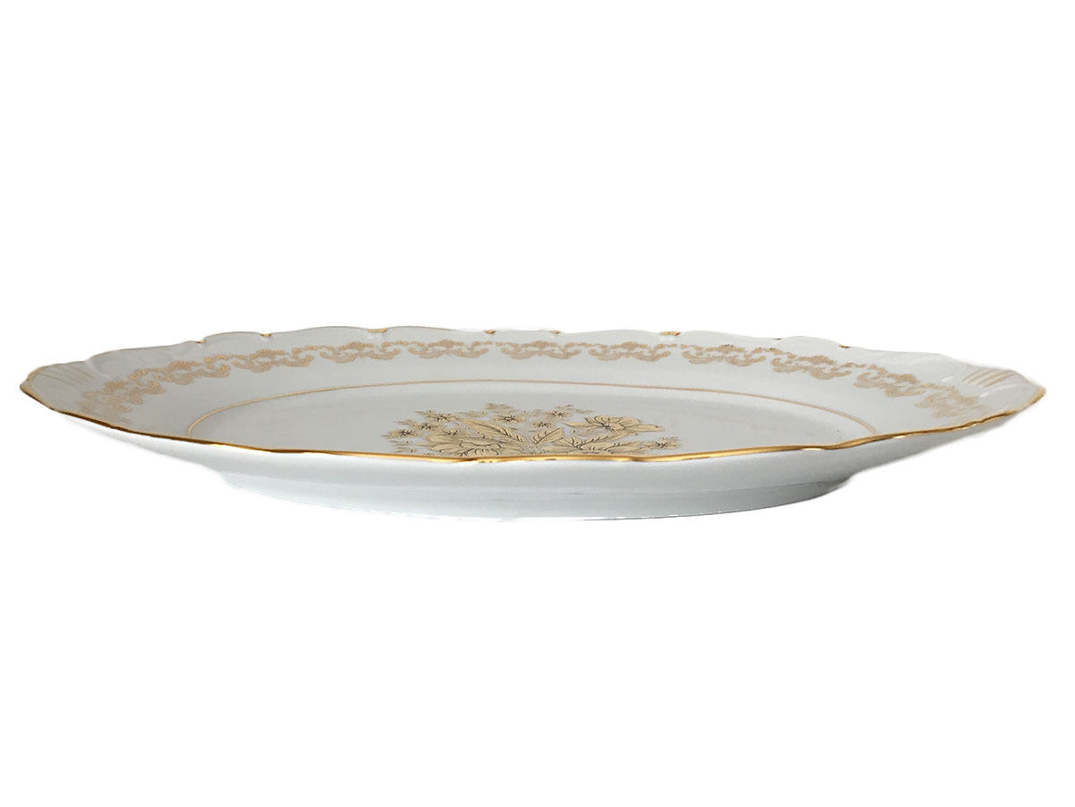 This beautiful and richly decorated serving dish boasts hand decorated designs of 24 karat gold atop a classic white background. It has a beautifully painted arrangement of gold flowers in the center with a rim of decadent designs around the edges.