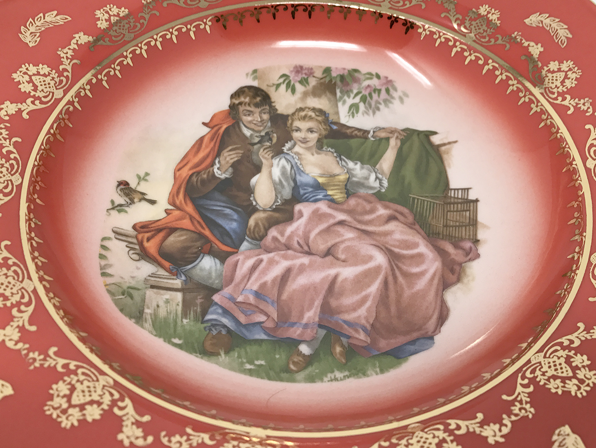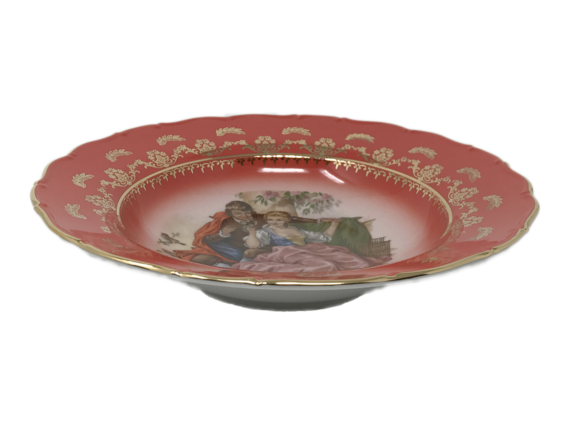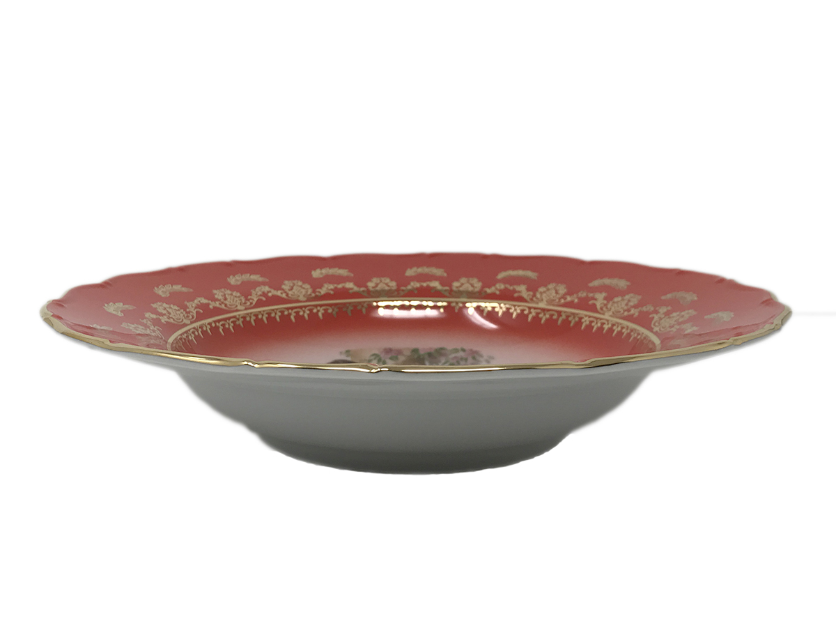 • Hand decorated designs and rims of 24 karat gold rest atop a scarlet red background with the classical images placed in the center of each piece.