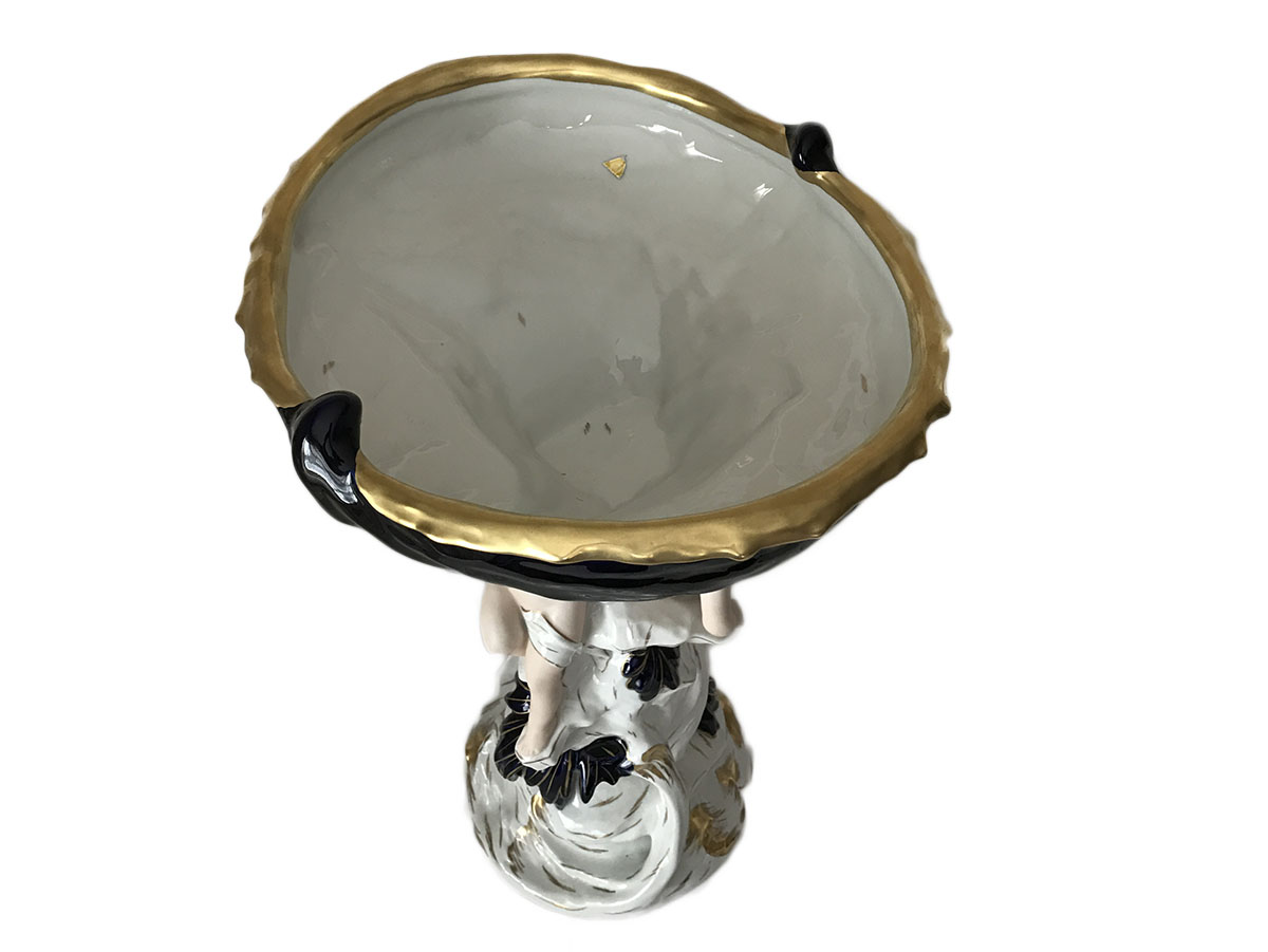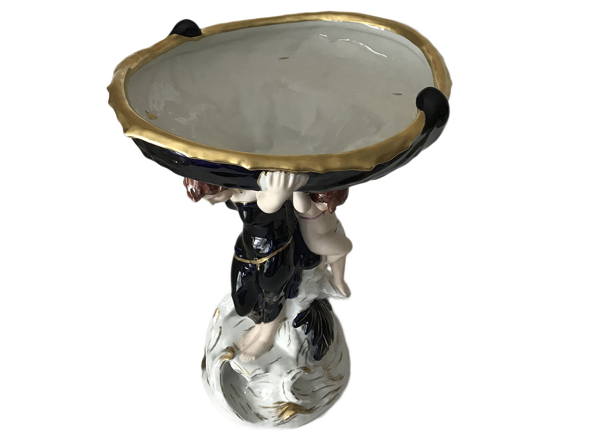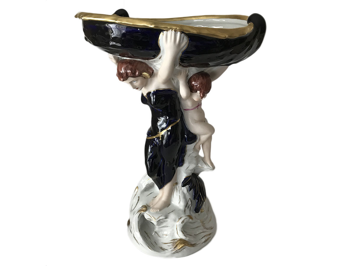 • Classical Royal Dux Bohemia large decorative porcelain sculpture features three figures (boy girl and women) holding a bowl / tray above
